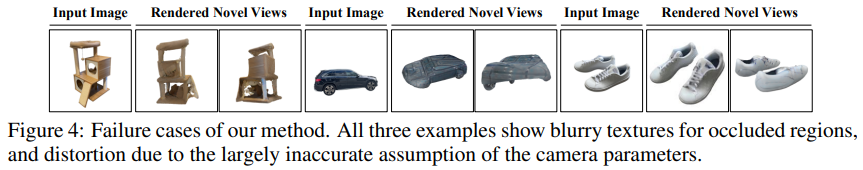 - 그림 2는 단일 이미지에서 재구성된 모양의 몇 가지 예를 시각화함. 전반적으로 결과는 뚜렷한 질감을 지닌 다양한 피사체의 실제, 생성 및 렌더링된 이미지를 포함하여 다양한 입력에 대해 매우 높은 충실도를 보여줌. 복잡한 형상이 올바르게 모델링되었을 뿐만 아니라 (예: 의자, 깃발, 닦음) 나무 공작의 질감과 같은 고주파수 세부 사항도 모델링되었음.