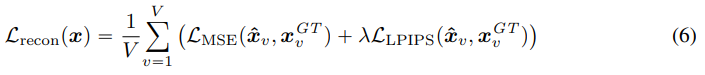 - V개의 render된 뷰들 $\hat{x}$ 와 ground-truth 뷰들 $x^{GT}$ 사이의 간단한 이미지 reconstruction objectives를 적용