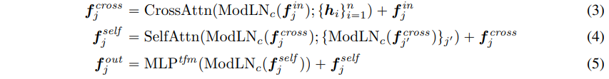 - sub-layers(i.e., CrossAttn, SelfAttn, $MLP^{tfm}$) 안의 ModLN operators는 layer normalization과 modulation $MLP^{mod}$ 안의 다른 학습 가능한 파라미터들 set 을 사용한다.