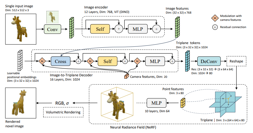 - LRM에는 입력 이미지를 패치별 feature token으로 인코딩하는 이미지 인코더와 corss-attention을 통해 이미지 fature를 삼중 평면 토큰에 투영하는 이미지 3D decoder가 포함되어 있음